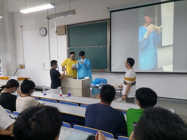 本次活动注重实践操作。宋火松和黄耀东现场教学犬猫的保定、手术服和无菌手套的穿戴方法、打外科结、皮内缝合等临床常用基本诊断和治疗技术。随后在外科临床实验室宋火松给同学们讲解并演示犬麻醉的诱导以及吸入麻醉、讲解呼吸麻醉机的使用方法及注意事项。黄耀东给同学们讲解并演示犬的留置针操作以及硬脊膜外穿刺麻醉。有效的给同学们拓展了教学以外的临床技术。与学生交流环节,同学们踊跃发言,争相提问,对宠物现状、专业前景、市场导向、工作薪资、发展方向、现代宠物服务等方面提出了不同的问题。两位专家耐心细致地一一作出回答,解答了同学们心中的疑问,坚定了同学们的专业思想。