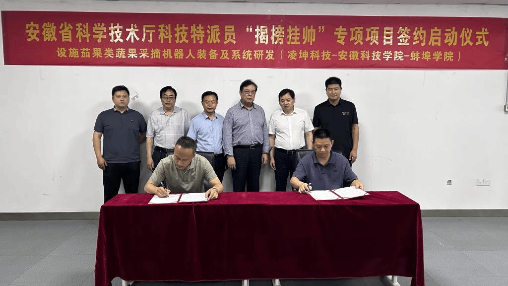 安徽省科学技术厅科技特派员“揭榜挂帅”农业物质技术装备专项项目,属于安徽省科技重大专项项目,乐鱼平台_乐鱼(中国)一站式服务平台机械工程学院材料成形及智能装备团队申报的“设施茄果类蔬果智能采摘机器人装备及系统研发”获批立项,这也是乐鱼平台_乐鱼(中国)一站式服务平台首次获批省级揭榜挂帅项目;该项目省级支持资金100万,地方按照1:1配套资金。6月2日,发榜方和揭榜方在安徽凌坤智能科技有限公司举行项目启动和各方责任履约签约仪式,蚌埠市科技局副局长杨怀波、乐鱼平台_乐鱼(中国)一站式服务平台科研处处长陈丰、安徽凌坤智能科技有限公司董事长潘成刚等参加签约启动仪式。