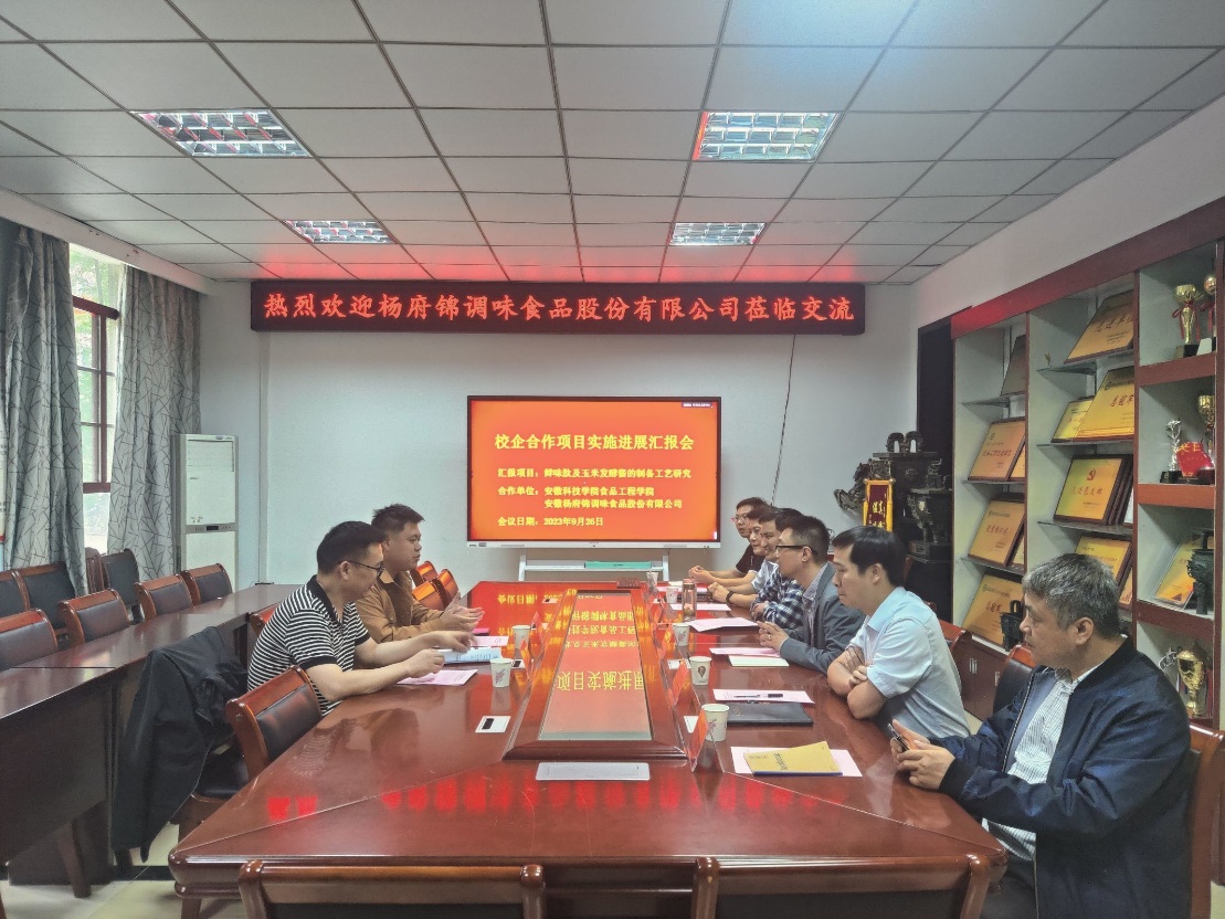 9月26日上午,安徽杨府锦调味食品股份有限公司总经理杨传益、副总经理蔡天赐来乐鱼平台_乐鱼(中国)一站式服务平台凤阳校区食品工程学院开展校企合作项目进展汇报推进活动。食品工程学院党政领导和畜产有关负责人出席会议。会议由副院长翟立公主持。