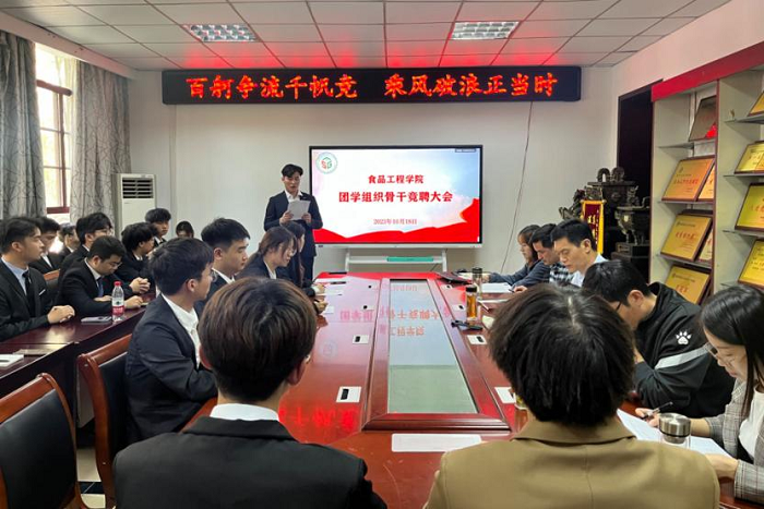 为加强学院团学组织队伍建设,优化骨干力量配备,更好地服务青年学生成长成才,食品工程学院于10月18日在学院会议室召开团学组织骨干竞聘大会。学院党委书记付光玺、副书记王广良出席大会。会议由学生会主席团成员王锦云主持。