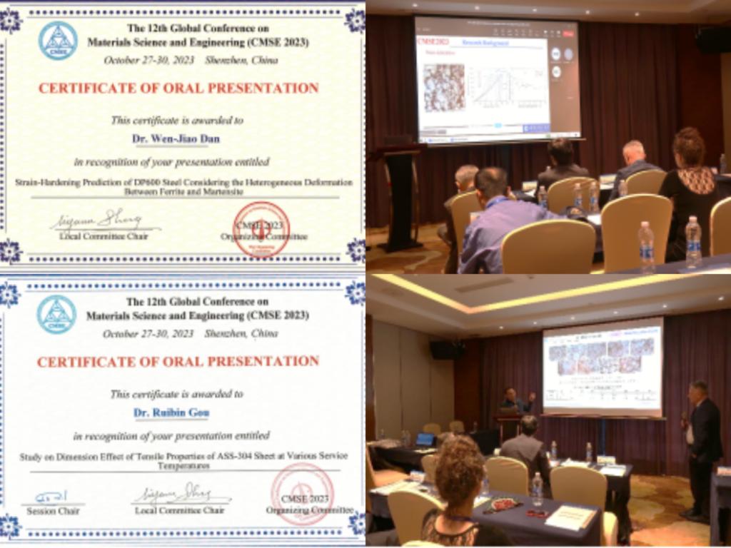 在大会上,但文蛟作了题为“Strain-Hardening Prediction of DP600 Steel Considering the Heterogeneous Deformation Between Ferrite and Martensite”的线上学术报告,缑瑞宾作了题为“Study on Dimension Effect of Tensile Properties of ASS-304 Sheet at Various Service Temperatures”的学术报告。