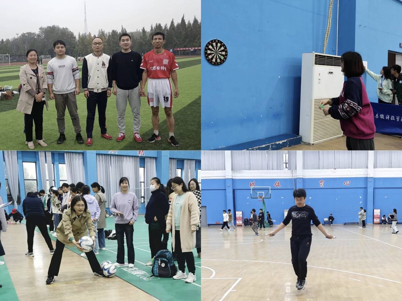 跳绳比赛中,赵干老师全神贯注,双手紧握跳绳,跳出了第三名的好成绩。飞镖赛场上,苗永美老师和姜毅老师分别获得第七名和第八名的好成绩。