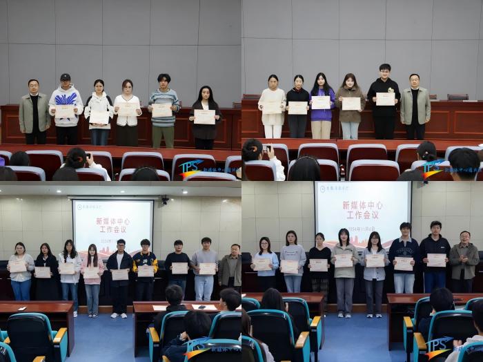 会上,陈晋宣读了党委宣传部新媒体中心2024上半年荣获“先进工作者”“优秀个人”“优秀讲解员”的名单,胡文靖为同学们颁发荣誉证书并合影留念。