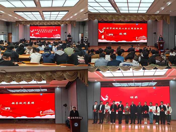 为进一步弘扬中华优秀传统文化,强化思想引领、凝聚思想共识,推进职工文化建设、丰富职工精神生活,11月6日下午,校工会联合蚌埠市财政局主办、电气与电子工程学院工会承办的“时代财力量,思政新征程”朗诵比赛在龙湖校区敏行楼A报告厅举行。蚌埠市财政局党组成员、副局长朱双仕,蚌埠市财政局工会主席唐淑琴,电气与电子工程学院党委书记骆海邦,校工会副主席邵传雷,电气与电子工程学院党委副书记、纪委书记尚磊出席本次活动。蚌埠市财政局四级调研员吴丽萍、电气与电子工程学院团委书记张成孜等担任本次朗诵比赛的评委。蚌埠市财政局、学校教职工代表参加了此次朗诵比赛。