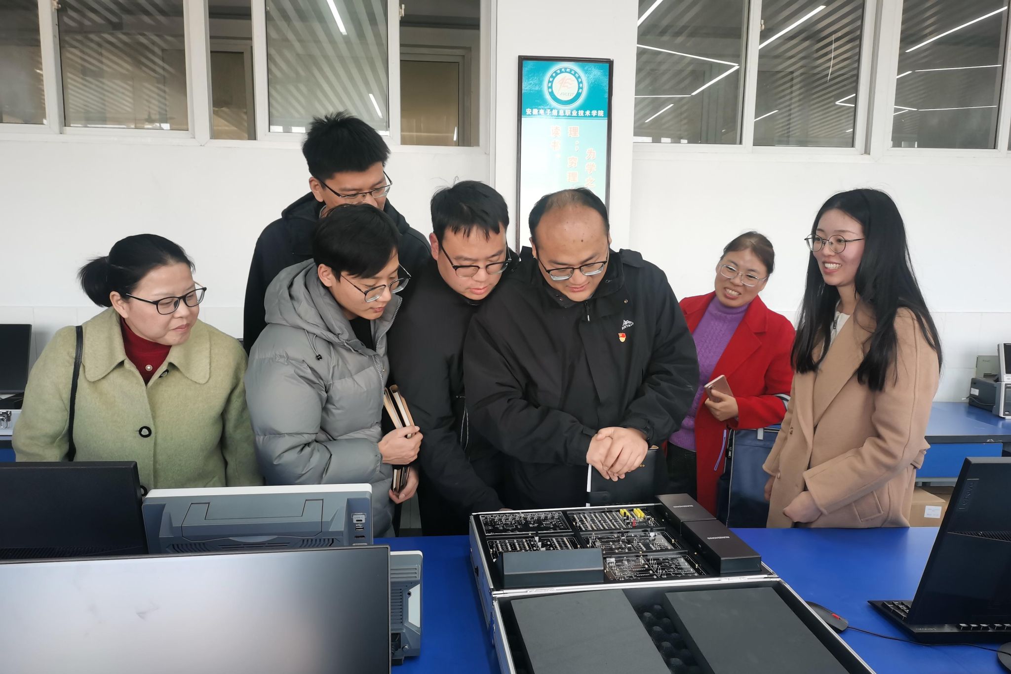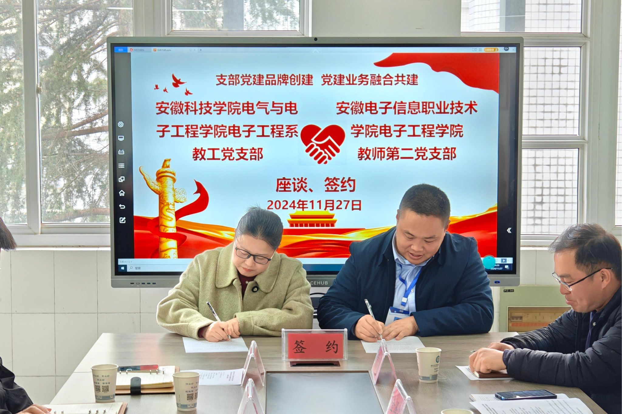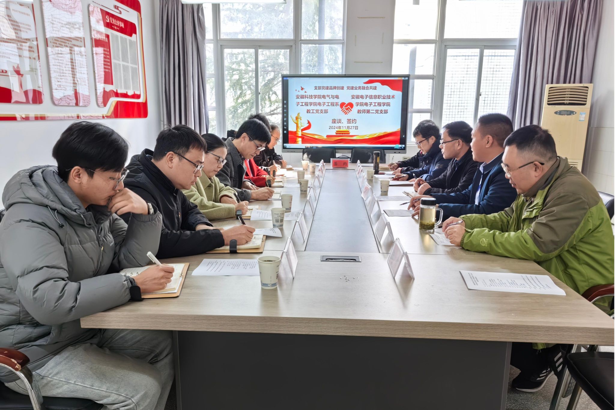 为拓宽高校基层党组织党建工作渠道,构建高校资源共享、相互促进、优势互补、共同提高的党建工作格局,11月27日下午,电气与电子工程学院副院长樊晓宇及电子工程系教工党支部6名党员教师赴安徽电子信息职业技术学院与电子工程学院教师第二党支部开展结对共建主题党日活动。安徽电子信息职业技术学院电子工程学院院长方庆山参加了结对共建签约仪式。