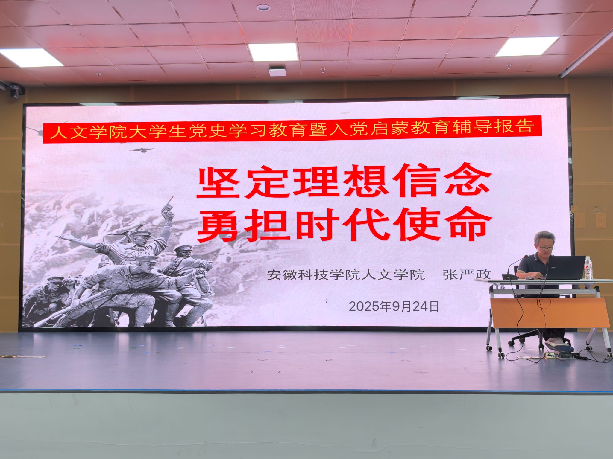 为引导广大青年学子从党的百年奋斗历程中汲取智慧和精神力量,明确新时代青年的使命任务,强化责任担当,9月24日晚,人文学院在图书馆二楼报告厅举办大学生党史学习教育暨入党启蒙教育辅导报告会。本次报告会的主题是“坚定理想信念,勇担时代使命”,由学院正处级组织员张严政主讲、辅导员刘佳主持,2025级全体新生参加。
