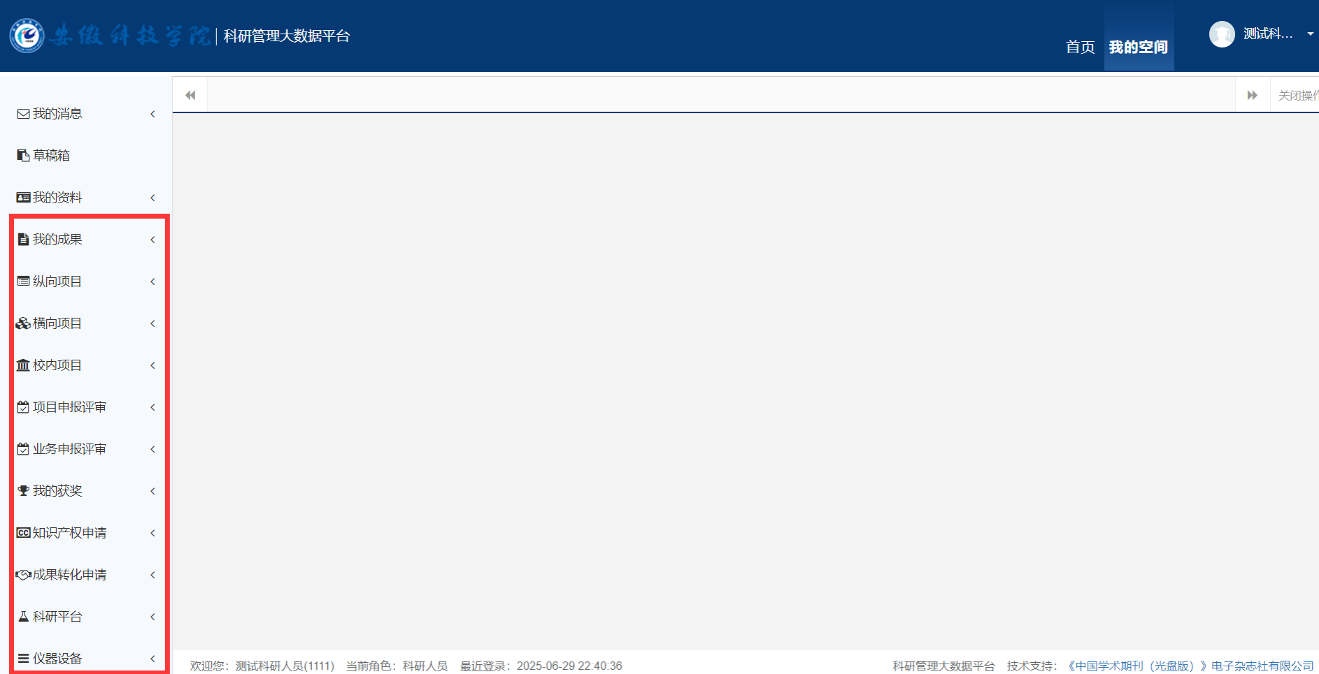科研人员通过科研系统能够完成日常科学研究工作,包括项目申报、项目立项、办理项目变更、办理项目经费入账、办理项目结项、知识产权申请、成果转移转化申请,仪器设备验收、平台考核、科研工作量考核等。科研管理人员通过科研系统能够管理、统计和分析各类科研数据,包括科研项目、项目经费、科研成果、考核奖励等。