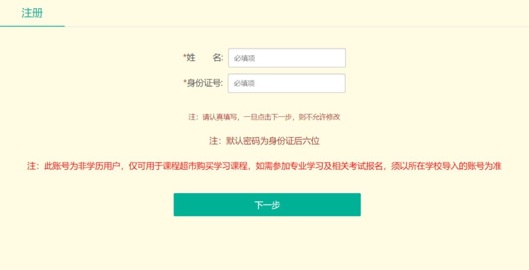 首次登录系统需点击“注册”,输入姓名和身份证号码,点击“下一步”注册按钮,注册后由所属机构的系统管理员在统一认证平台进行审核,审核通过后可进入师资库系统。注册页面如图2所示: