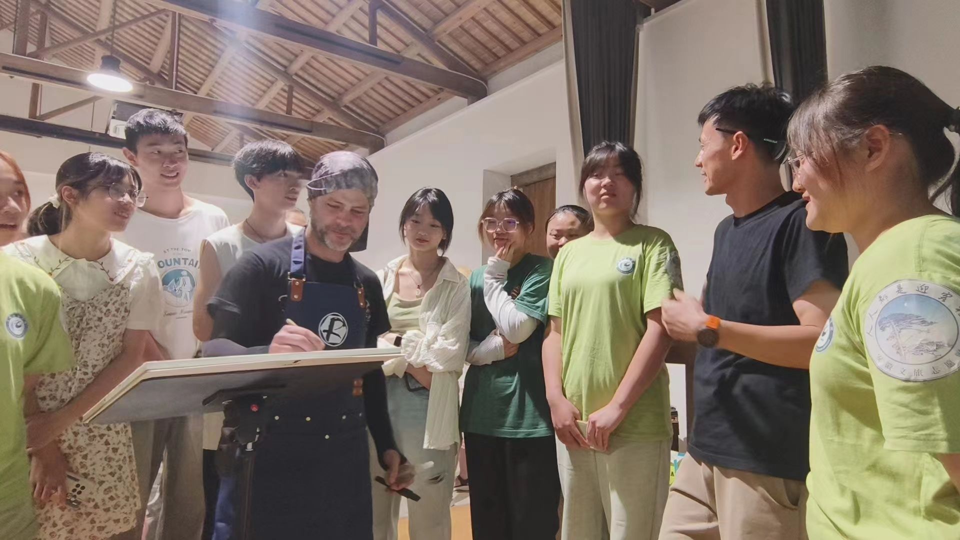 在西递黟山大学堂教室内,建筑学院的师生们与国际艺术家们展开了热烈而深入的交流与探讨。他们围绕作品的创作理念、技法运用以及艺术表现等方面展开了深入的讨论,共同分享彼此的艺术见解和创作心得。这种跨界的交流与合作,不仅为师生们提供了宝贵的学习机会,也进一步拓宽了他们的艺术视野和创作思路。