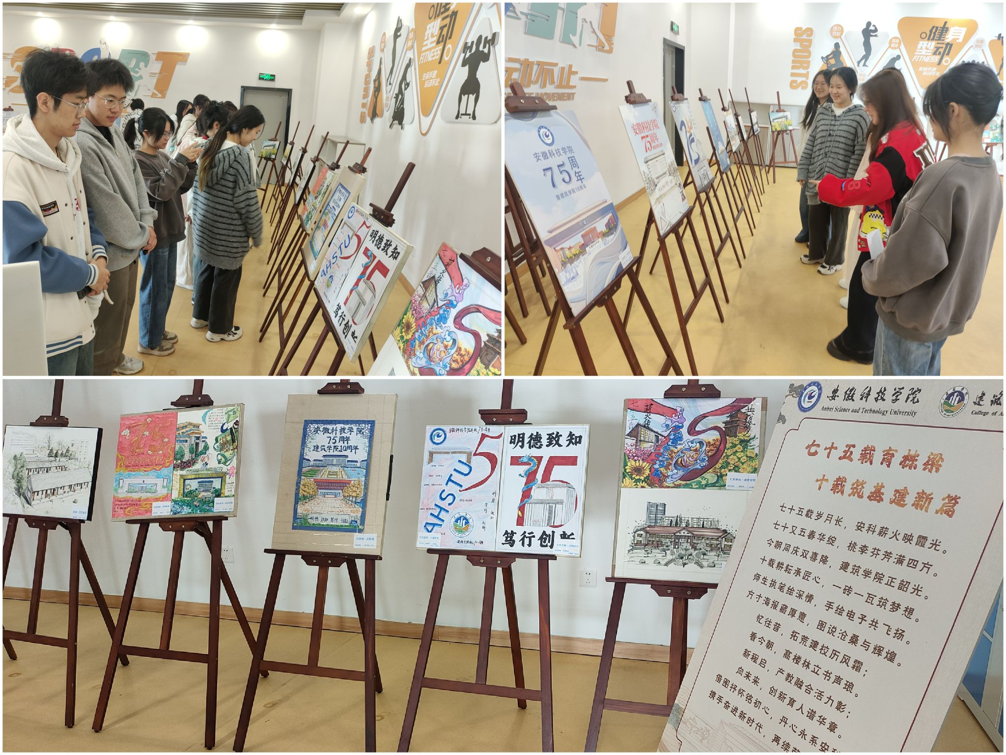 参展作品以图文结合的方式呈现,聚焦乐鱼平台_乐鱼(中国)一站式服务平台75年来的办学历程和建筑学院10年的发展足迹。有的作品回顾了学校发展中的重要节点,有的记录了学院成长中的难忘瞬间。同学们用简洁的文字和清晰的视觉设计,表达对校园生活的观察与思考。这些作品既体现了基本的设计能力,也流露出对学校和学院发展的关注。观展师生在驻足观看的过程中,不仅了解了校院的发展脉络,也在细节中感受到一种真实而朴素的情感共鸣。