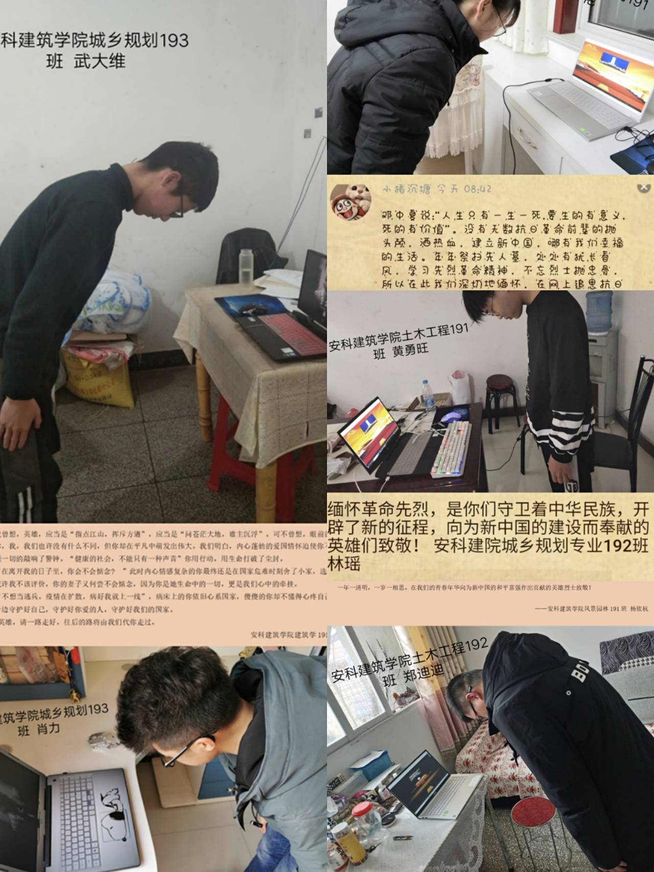 青年志愿者协会组织学生登录“烛光会”微信客户端,通过为革命烈士点烛、学习先烈事迹、寄语留言、传递心声的方式追悼先烈,表达自己的敬意。活动发起半小时内,近200人参加了此次网上祭扫活动。活动中,建筑学子们将追思之情诉诸云端。网名为“马小建”学生在追思留言中说到“作为新一代青年,我们更应该铭记英雄先烈,勿忘国耻。努力学好专业技能和知识,以身作则,积极弘扬革命精神,从而为祖国和人民做出更大贡献。”来自风景园林191班的杨依杭则写道“一年一清明,一岁一相思。向那些为新中国的和平富强做出贡献的英雄烈士们致敬!”同学们在留言中纷纷表示,无数英烈冲锋在前,用生命守护生命,我们应砥砺前行,用行动让他们放心!