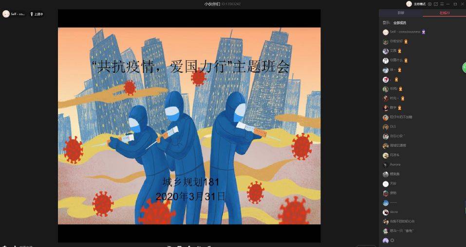 城乡规划171班开展了一场别开生面的线上讨论,在线分享了身边“共抗疫情”的生动故事,有战“疫”一线的志愿者,有守护后方的身边人,还有营造良好舆论氛围的网络宣传员,他们以赤子之心、爱国之行在这场疫情大考中提交了优异的答卷。