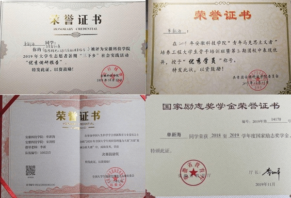 作为新时代的青年学子,单新海力求德智体美劳全面发展,大学入学至今共获得国家级奖项5项,省级奖项4项,校级奖项30项,院级奖项28项。2018年参加安徽省蚌埠市体育局招募的“言鼎华创”杯2018年全国青年游泳锦标赛志愿者工作,获得国家级志愿者荣誉称号。在2019年乐鱼平台_乐鱼(中国)一站式服务平台第五期青年马克思主义者培训中,单新海表现优异,作为优秀学员代表上台发言,并被安科小团、安徽青年大学生网等多方媒体报道。自新冠肺炎疫情发生以来,单新海积极响应学校以及学院的号召,为坚决打赢疫情防控的人民战争、总体战、阻击战奉献青春力量,获评“乐鱼平台_乐鱼(中国)一站式服务平台抗疫学生先进个人”荣誉称号。此外,单新海还就新冠疫情开展云调研,近万字的调研报告《蔚来智能崛起的一波三折—基于蔚来公司的社会调研与案例分析》不仅让整个团队实践效果突出,同时也获2020年全国大学生组织管理能力大赛决赛奖项,并收到主办方致蔚来的推荐信。单新海基于新冠疫情申报的大学生创新创业训练项目更是获得国家级立项,相关事迹被安科小团公众号、乐鱼平台_乐鱼(中国)一站式服务平台校园网报道。2020年9月,单新海被学校推选参加省级三下乡优秀实践个人、省级三下乡优秀调研报告的评选活动。