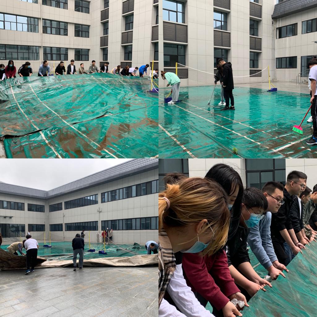 同学们首先对被暴雨冲乱的一楼空场地进行了打扫和整理,一起将掀翻的羽毛球胶地铺开整平,清扫干净;接着,他们手持各种工具,对场地周边比较难去除的污迹进行了清除,女生用抹布擦拭,捡走树叶和垃圾,男生们则用拖把用力清理胶皮上的污渍,不断冲刷。经过一个多小时的劳动,脏乱的场景不见了,干净整洁的场地和楼道呈现出来,同学们分享着劳动成果,享受着劳动的过程。