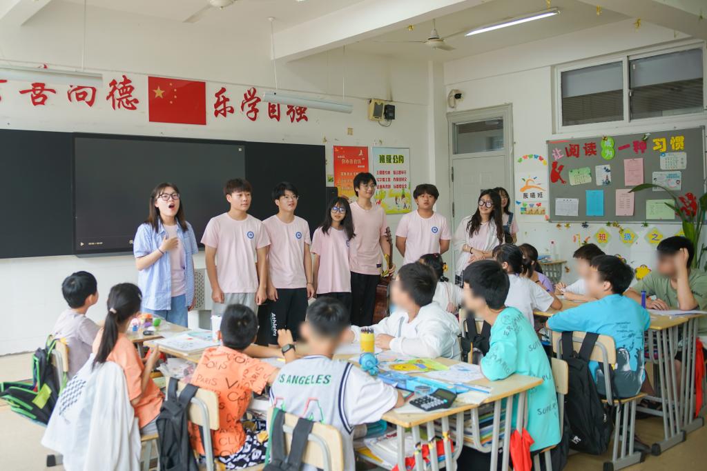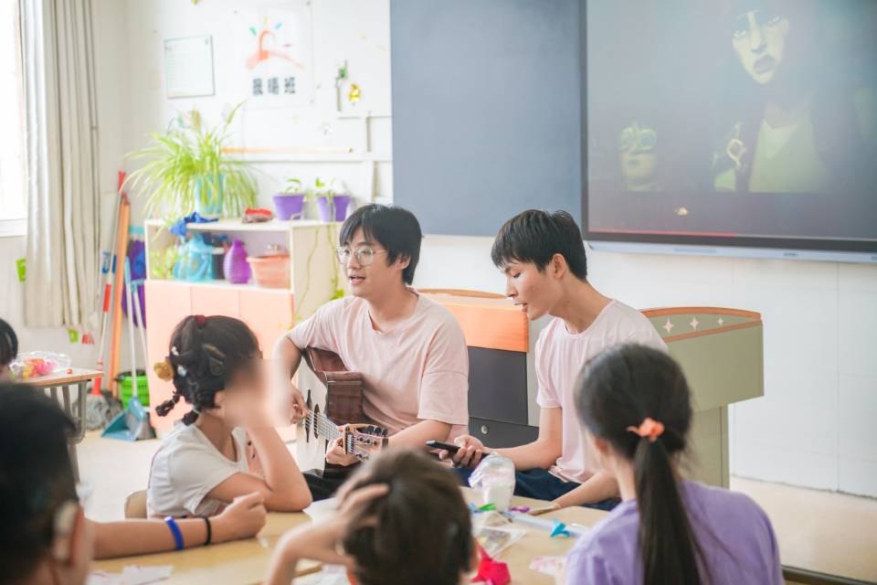 当《孤勇者》的前奏响起,团队成员花凯旋和李席旺的激情弹唱带动了全场。“人只有不完美值得歌颂”“谁说站在光里的才算英雄”一句一句的歌词,鼓舞着教室里的每一位听众。孩子们欢呼雀跃、手舞足蹈,拉上班主任向团队成员点歌一首《童年》。随着一声声“池塘边的榕树上,知了在声声叫着夏天”,团队成员们仿佛也回到了童年的夏天,每个人脸上都露出天真的笑容。孩子们的语言和听力虽有障碍,但是带着人工耳蜗的他们也能听到感受到音乐的律动,跟着大哥哥大姐姐一起晃动身体,享受着音乐,沉浸在奇妙的体验当中。