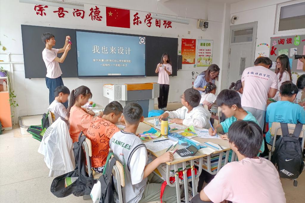 实践团来到听障四年级一班教室,在与班主任胡向红老师交流活动内容后,团队成员纷纷用手语向孩子们介绍自己的姓名和爱好,不太娴熟的肢体展示拉近了同孩子们的距离,开启了别样的“五育”互动。