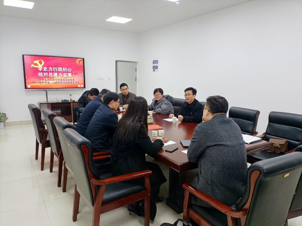 为深入推进党史学习教育,进一步落实我为群众办实事,12月8日下午,建筑学院党委与蚌埠市第一人民医院门诊医技党总支联合开展“学史力行践初心 结对共建办实事”主题党日活动暨党建共建签约仪式。建筑学院党委书记傅友福、党委副书记谢宜勤、团委书记沈德艳,蚌埠市一院门诊医技党总支书记梁友宝、党总支副书记严雪旸、党办主任高春艳等相关人员参加了此次活动。