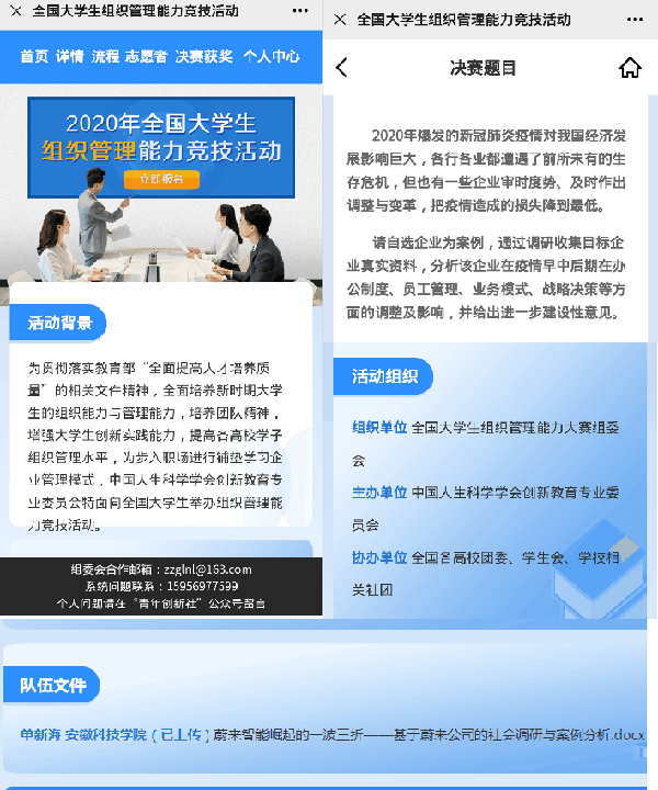 为助力疫情防控,促进经济社会发展,建筑学院土木工程专业单新海、宋剑桥两位同学组成助力企业复工复产青年志愿服务小队,就安徽合肥蔚来公司的疫情复工复产情况展开“云”调研。所撰写的分析报告《蔚来智能崛起的一波三折—基于蔚来公司的社会调研与案例分析》,近期荣获2020年全国大学生组织管理能力大赛决赛奖项,并收到主办方合肥蔚来公司的表扬信。