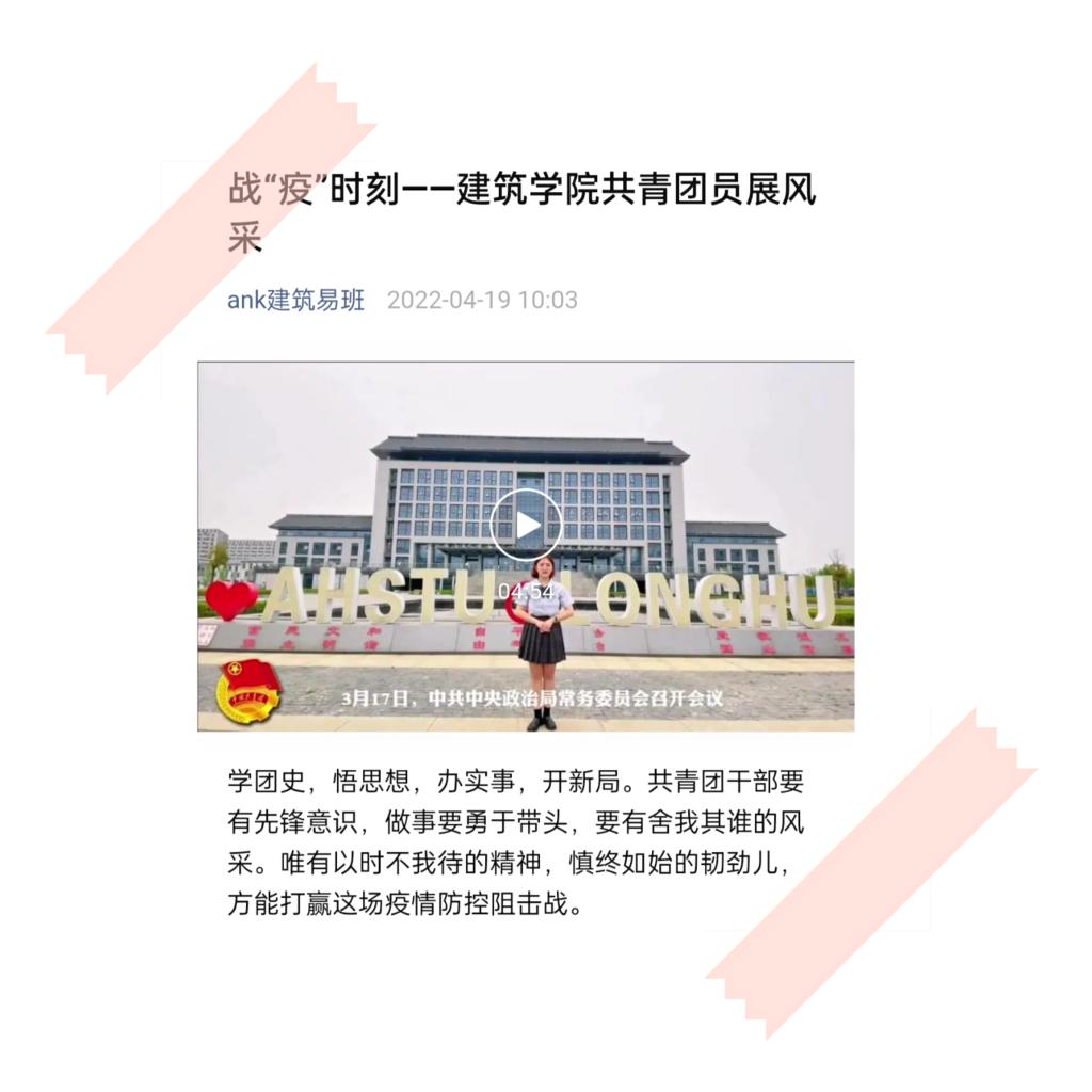 团支部录制的《战“疫”——共青团员的中坚》视频,充分体现了广大团员青年在疫情防控阻击战中贡献青春力量的热情和决心。视频中,张雨欣同学就当下疫情形势进行了系统地讲解,她号召全体共青团员要发挥党的助手和后备军作用,带领班级学生积极作为。罗志娟同学讲述了疫情防控期间建筑学院学子积极参加劳动实践、体育锻炼和文化活动,号召广大青年继续争当表率,以实际行动坚定战胜疫情的决心和勇气。该视频在乐鱼平台_乐鱼(中国)一站式服务平台建筑学院易班微信平台发布后,反响良好,得到师生一致好评。