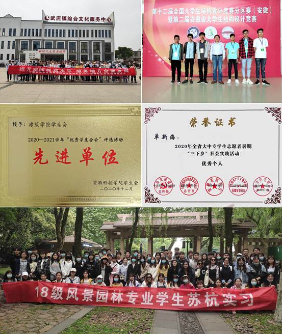 荣获国家林草局梁希科技进步二等奖1项,安徽省优秀城市规划设计二等奖2项,安徽省园林绿化“徽园杯”铜奖,安徽省哲学社会科学成果三等奖1项,河南省教育厅科技成果二等奖1项。主持和参编安徽省地方标准10项,获得安徽省科技成果10项。安徽省教学成果特等奖1项、二等奖1项、三等奖5项。全国教师教学技能大赛一等奖1项,长三角教师智慧教学大赛三等奖1项,全国高校教师教学创新大赛安徽赛区二等奖、三等奖各1项,安徽省本科师范院校智慧教学大赛一等奖、三等奖各1项。安徽省一流专业建设点1个,省级教学团队1个。先后承办安徽省乡村规划设计大赛、安徽省大学生结构设计大赛、安徽省高校建筑信息模型(BIM)大赛等专业技能竞赛。获得省以上竞赛荣誉150余项,省以上优秀组织奖6次。拥有土地规划乙级资质。为社会培养土木和建筑类专业人才6000余人。