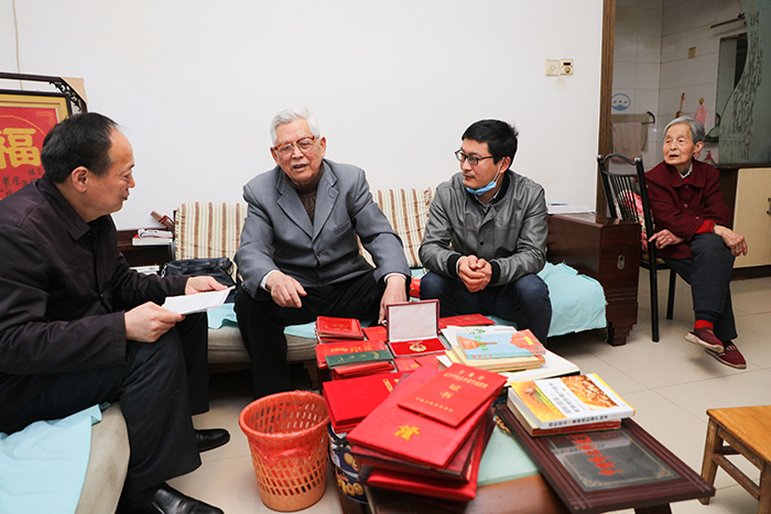 4月28日,校离退休党总支副书记时乾带领离退休工作处、校史馆建设领导组办公室相关工作人员等一行5人专程前往淮南市拜访乐鱼平台_乐鱼(中国)一站式服务平台退休老同志李位三、李启松夫妇。