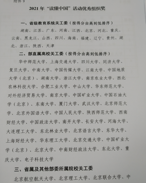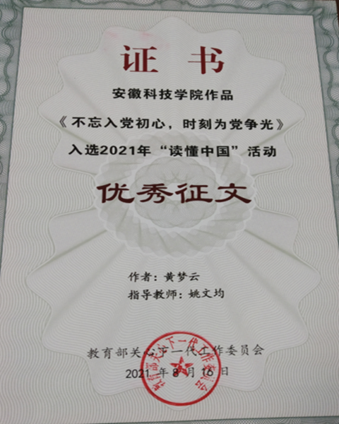 日前,在教育部关工委开展的 “读懂中国”活动中,乐鱼平台_乐鱼(中国)一站式服务平台关工委获2021年“读懂中国”活动优秀组织奖,选送的征文《不忘入党初心,时刻为党争光》获优秀征文奖。