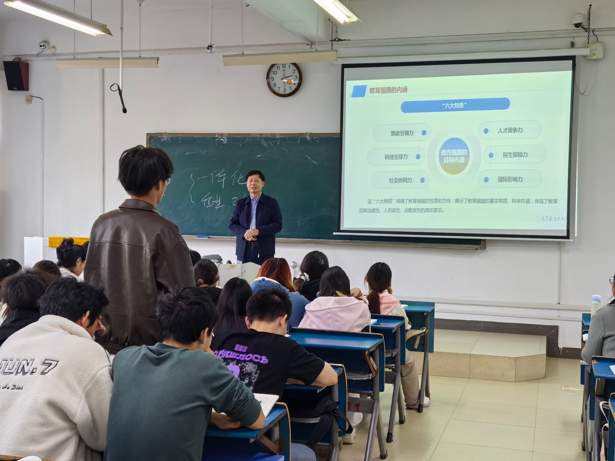 课堂上,时伟围绕“办好人民满意的教育”这一专题,结合党的二十大和党的二十届三中、四中全会精神,从历史逻辑、理论逻辑和实践逻辑三个方面,运用大量翔实数据,深入讲授教育是民族振兴和社会进步的基石,教育兴则国家兴、教育强则国家强,激发学生共同探索如何建设教育强国,引导青年学生立报国强国大志向、做挺膺担当奋斗者。