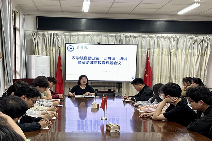 为进一步规范和加强学生资助管理工作,有效开展学生资助诚信教育主题月系列活动,农学院于5月11日下午在东办公楼120召开资助政策“两节课”培训暨2024年资助诚信教育主题月专题工作布置会。辅导员张涛、农学院学生会权益部门成员及21-23级各班生活(资助)委员参加本次会议。会议由农学院专职辅导员田文倩主持。
