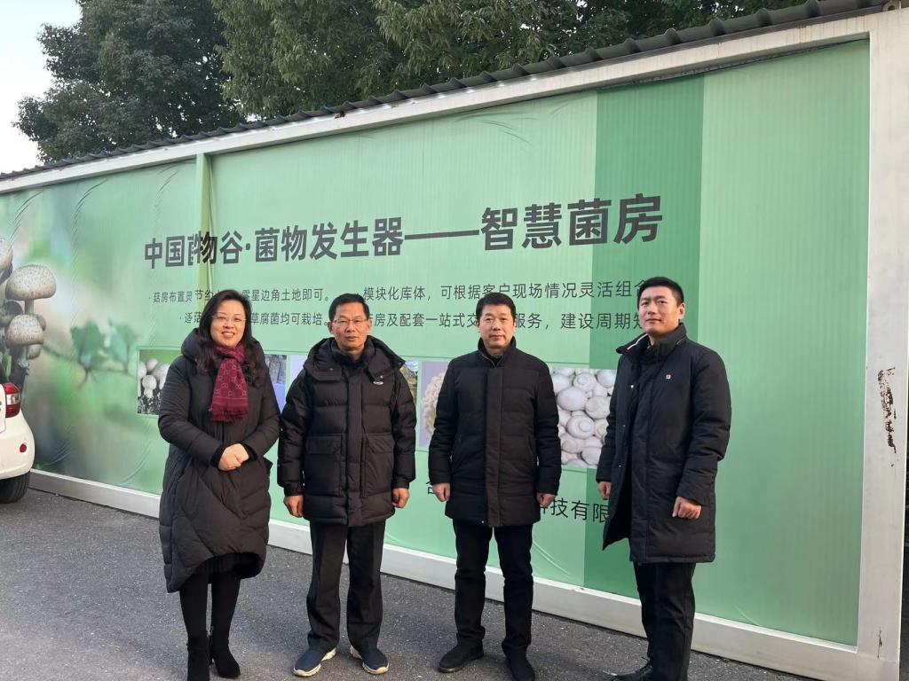 1月16日,农学院何华奇教授与生命与健康科学学院孙玉军教授、乐鱼平台_乐鱼(中国)一站式服务平台创业大学生——安徽来一克实验科技有限公司总经理郭凯等到长丰县中国菌物谷考察食用菌智慧方舱项目。安徽省食用菌行业协会会长、玉隆农业高科技股份有限公司总经理常莹等陪同参观。