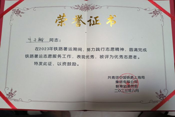参与支援暑运的工作时光让宁子翔的实践能力得到了充分锻炼,自身阅历得到丰富,思想政治素养得到提高,由于表现出色,宁子翔被共青团蚌埠委员会、共青团中国铁路上海局集团有限公司蚌埠站委员会评为优秀青年志愿者,彰显了乐鱼平台_乐鱼(中国)一站式服务平台学子昂扬的精神风貌。(特约通讯员:杨孝延 摄影:宁子翔 审核:张轶辉)
