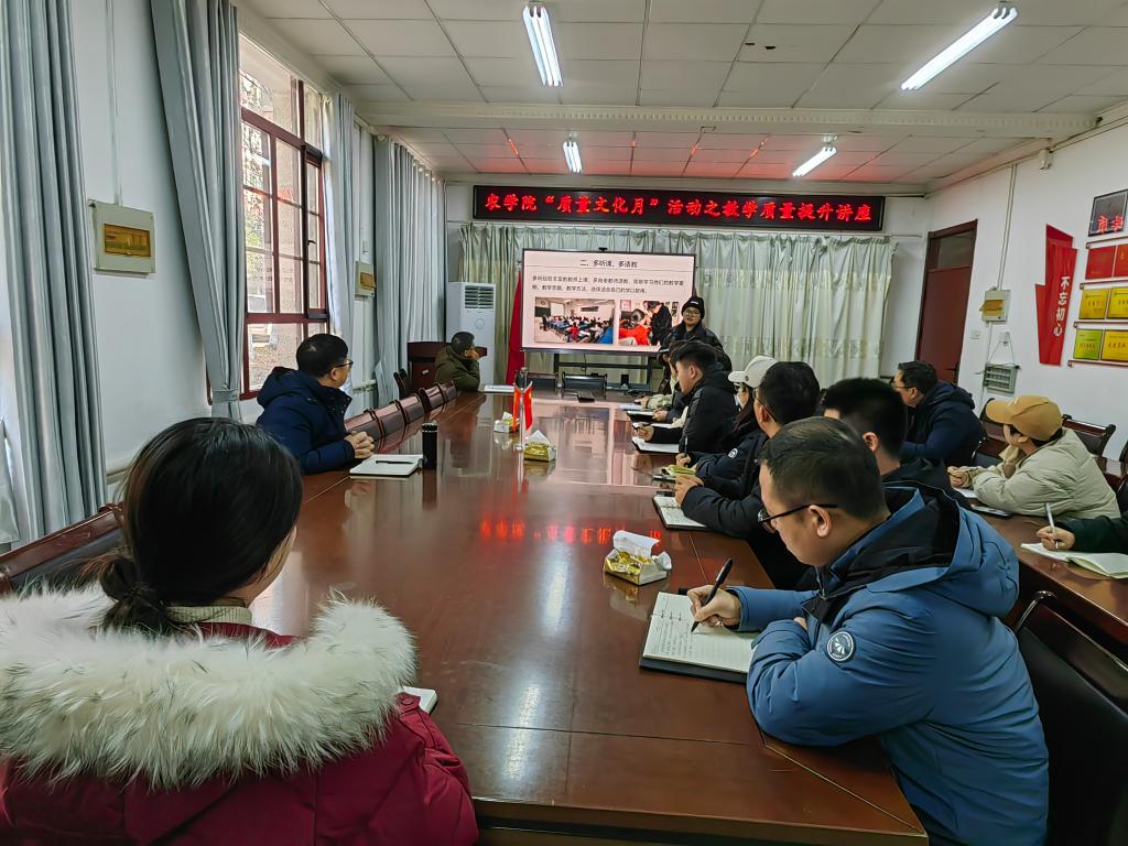 为有效提升我院青年教师的创新能力和教育教学水平,促进教学水平上新台阶。12月20日上午,农学院以“质量文化月”活动为载体,开展了“教学质量提升”主题讲座。农学院副院长舒英杰主持会议,党委副书记张轶辉和2020年以来入职的教师参会。