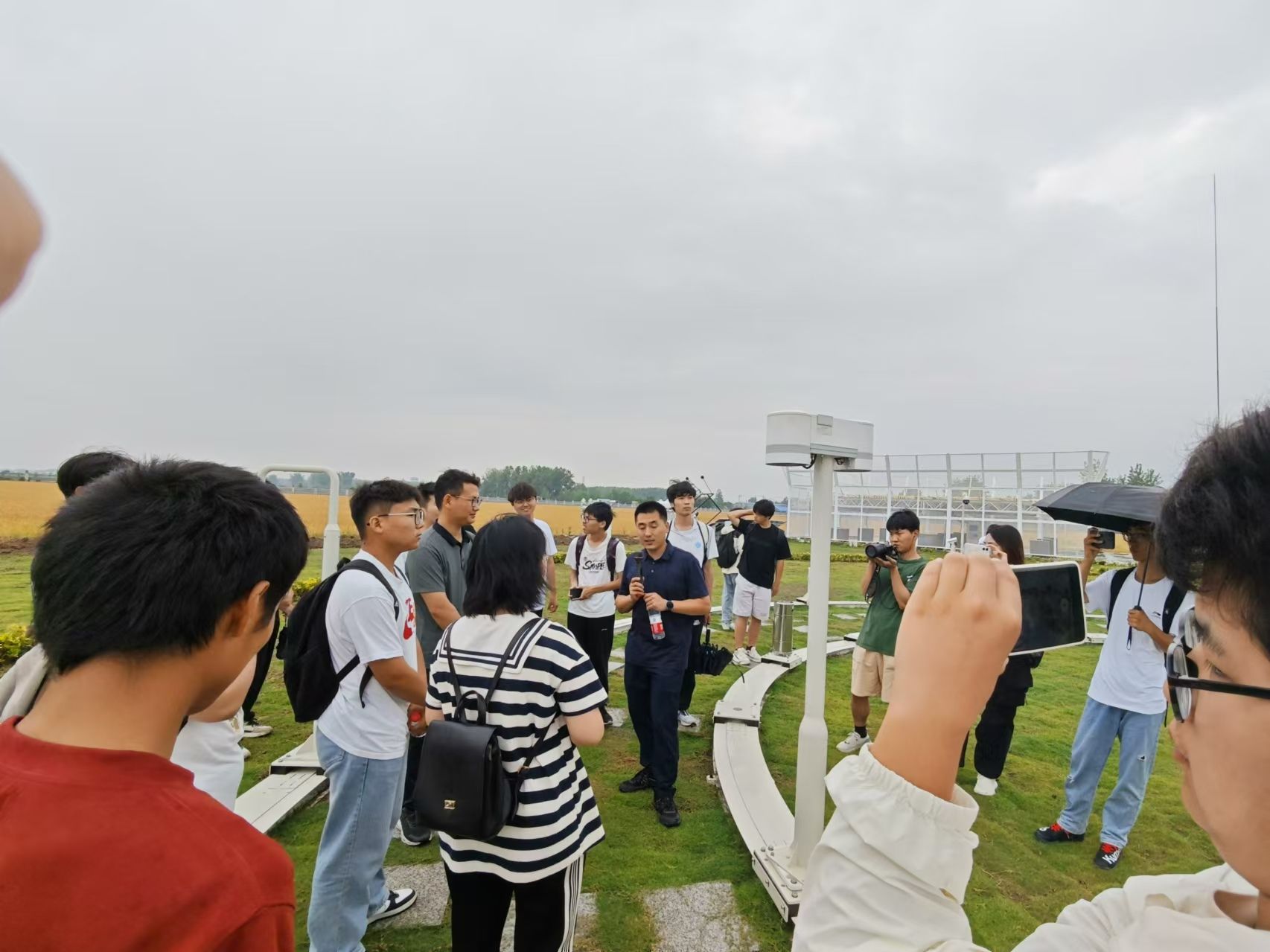 在观测现场,通过讲解员对仪器设备的介绍和演示,同学们对气象观测的各个环节有了更加直观的认识,高高耸立的100米通量观测铁塔,是目前华东地区最高的气象观测铁塔,一台台精密仪器24小时实时监测地面、高空各种气象要素和大气成分、近地层通量等数据。互动问答环节学生们积极提问,争相发表自己的观点,展现出对气象科学的浓厚兴趣,尽管当天下着小雨,丝毫不影响同学们的学习热情。