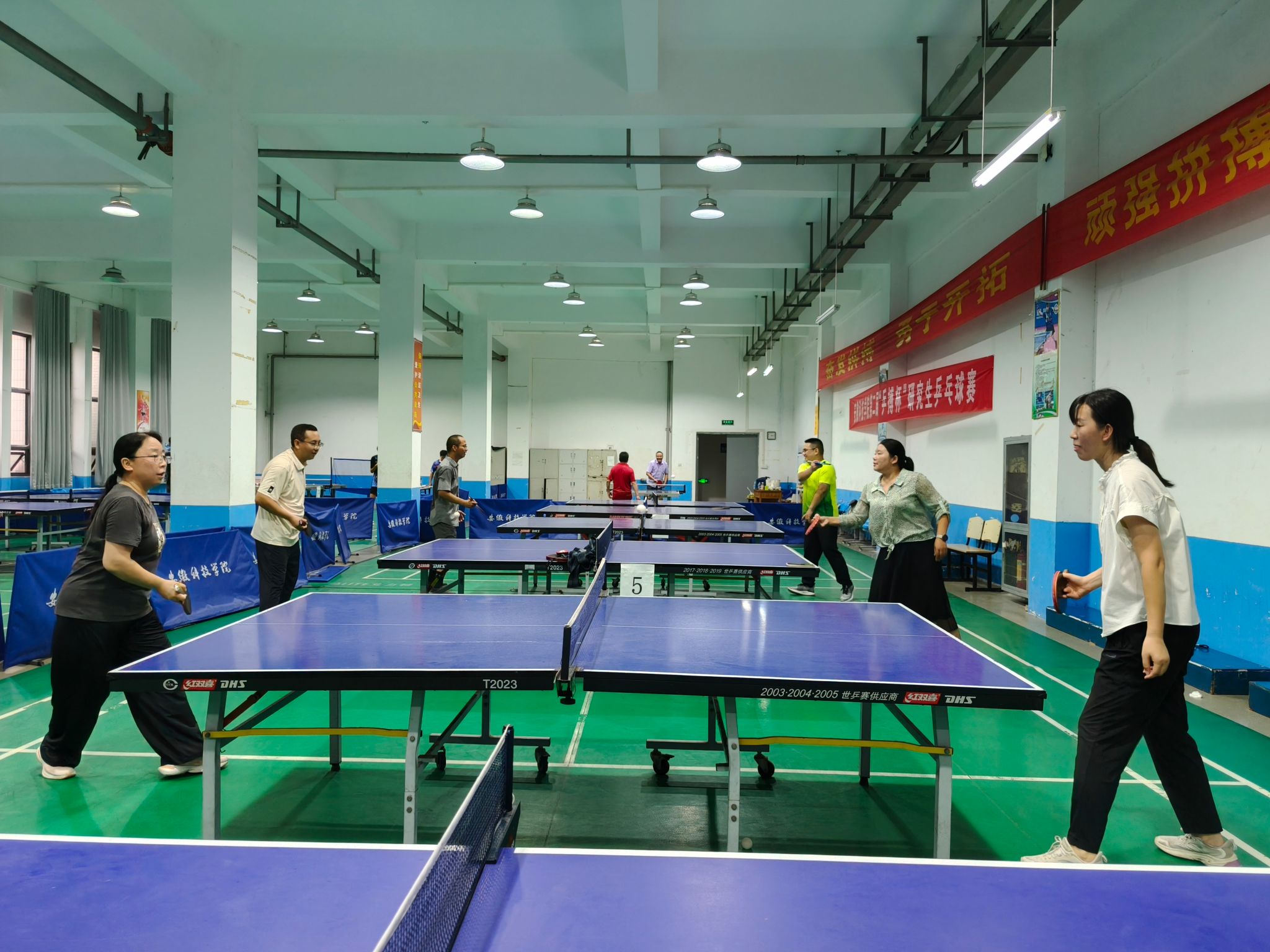 赛场上,每名参赛选手都沉着应战,尽力发挥自己的水平,只见你一拍我一板,相互较量着,打得是难解难分,不相上下,动作姿势虽然不是很标准,水平不是特别高,但是打起来也是有板有眼,好球不断,掌声连连,老师们用汗水庆祝自己的节日。