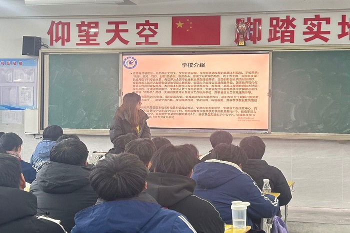 回到母校后,团队成员看望了高中班主任和任课老师,向他们汇报了自己在安科的收获和成长。黄慧茹带领学弟学妹们观看安科宣传视频,从历史底蕴、发展前景、学科专业、师资力量等方面详细介绍了安科的优势和特点,团队成员陆晨曦、程思远、梅宇豪也分享了各自的大学生活。提问答疑环节,团队成员们也耐心回答了学弟学妹们的各种问题,让同学们对安科有了更深入的了解。
