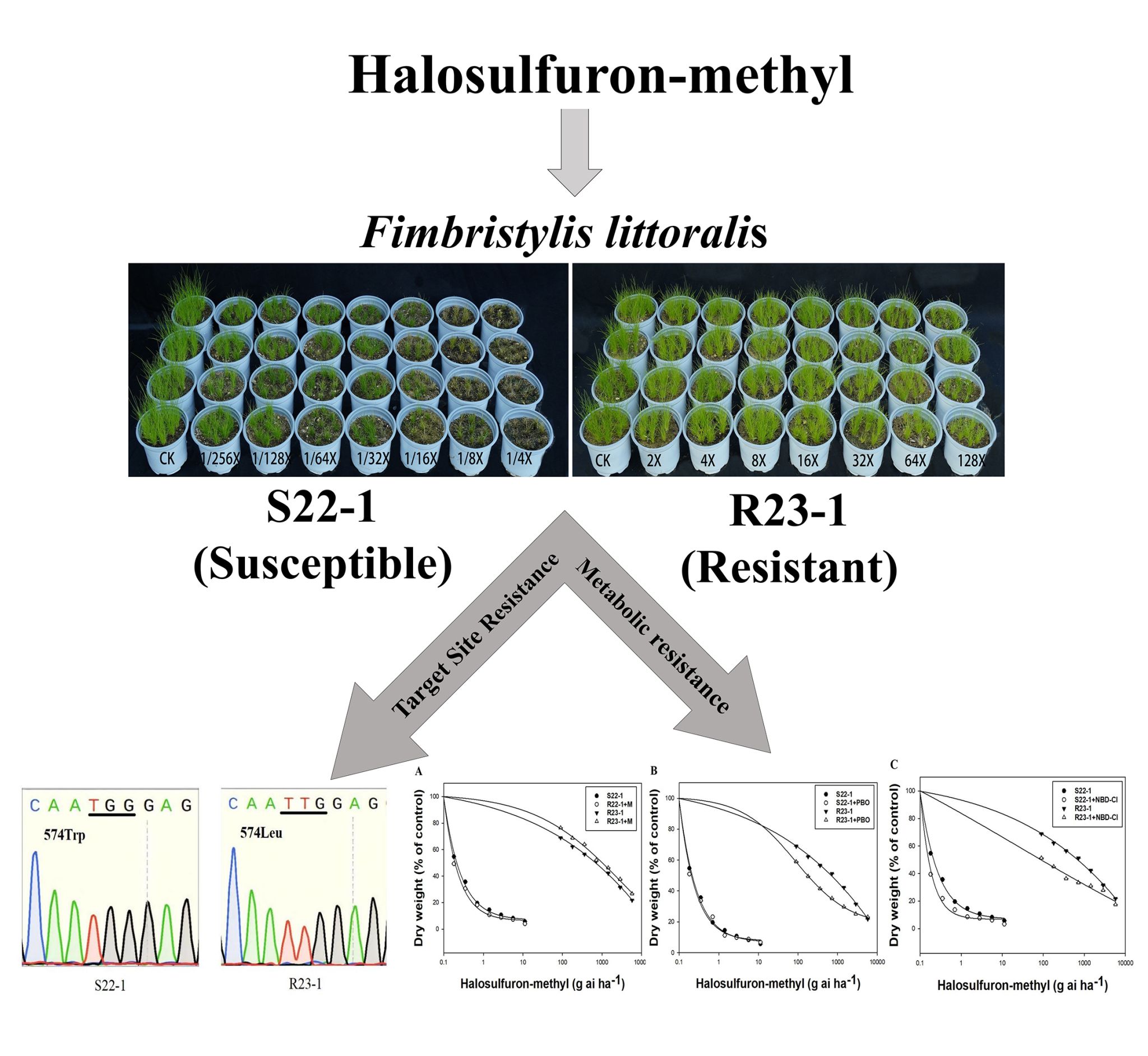 水虱草为我国稻田主要恶性杂草,长期依赖氯吡嘧磺隆等ALS抑制剂类除草剂防控。本研究鉴定了一个对氯吡嘧磺隆具有极高抗性的水虱草种群R23-1,其抗性指数(RI)高达3441.66。通过基因测序发现,该种群ALS基因发生Trp-574-Leu突变,分子对接试验证实该突变显著降低ALS蛋白与除草剂的结合亲和力。代谢试验表明,P450s抑制剂PBO和GSTs抑制剂NBD-Cl显著增强了R23-1种群对氯吡嘧磺隆的敏感性,协同比分别为4.11和8.15。交互抗性试验结果表明,R23-1种群对其他ALS抑制剂类除草剂均表现出交互抗性。该研究首次阐明水虱草对ALS抑制剂类除草剂的抗性由靶标抗性(TSR)与非靶标抗性(NTSR)协同介导。(特约通讯员:汪道兵 摄影:史悦悦 审核:李文阳 何世潮)