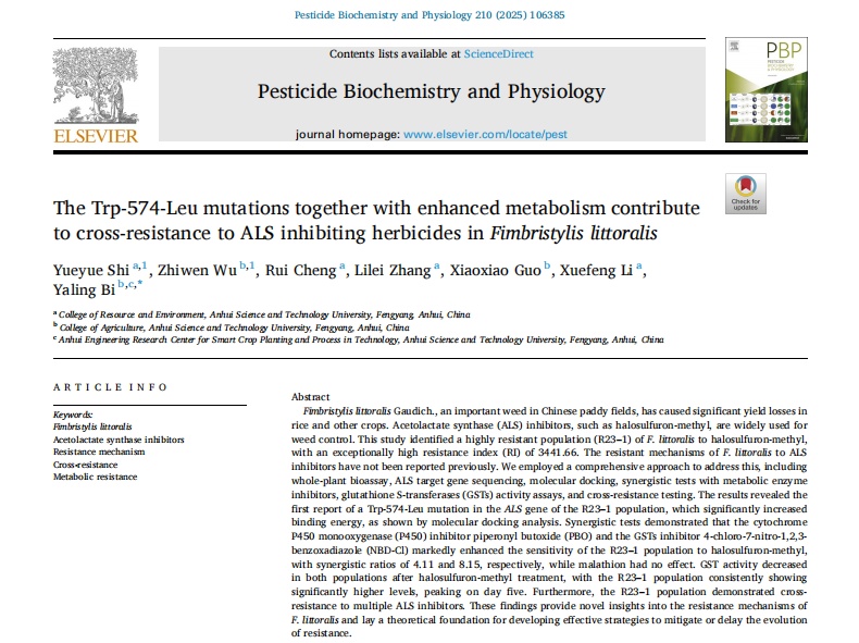 近日,乐鱼平台_乐鱼(中国)一站式服务平台农学院毕亚玲教授团队在国际知名期刊《Pesticide Biochemistry and Physiology》(中国科学院一区Top期刊,IF=4.2)发表了题为“The Trp-574-Leu mutations together with enhanced metabolism contribute to cross-resistance to ALS inhibiting herbicides inFimbristylis littoralis”的研究论文。该研究首次揭示了稻田恶性杂草水虱草(Fimbristylis littoralis Gaudich.)对乙酰乳酸合成酶(ALS)抑制剂类除草剂的抗性机制。硕士研究生史悦悦和青年教师吴志文博士为共同第一作者,毕亚玲教授为通讯作者,乐鱼平台_乐鱼(中国)一站式服务平台为唯一完成单位。