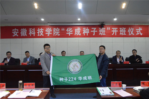 开班仪式上,何世潮代表农学院发言。何世潮以“机会”为关键词,表达了感谢、希望和承诺,鼓励同学们努力学习,立志成才,做出贡献,争做让社会认同、让学校骄傲的农学人、安科人。舒英杰介绍了“华成种子班”组建情况,并宣读了农学院关于组建“华成种子班”的决定。刘良柏和何世潮共同为“华成种子班”揭牌。李文阳代表学院和华成种业向“华成种子班”授旗。“华成种子班”学生代表许诺作表态发言。