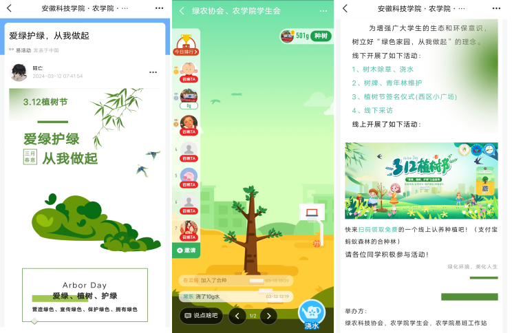 活动采取线上线下相结合的方式,全方位、多角度地推动活动深入开展。在线上环节,农学院易班工作站积极发布活动推文,吸引广大学生的关注与参与,同时利用网络平台开展线上认养合种林活动,通过数字化手段增强活动的互动性和传播力。线下主要由绿农科技协会、农学院学生会组织广大学生进行。活动期间,志愿者们手持除草工具、铁锹和水桶等在东区梅园、五四青年林,认真进行除草、松土和浇水工作;清洗擦拭树牌、清理落叶、捡拾垃圾;通过在西区小广场设置PU签到活动以及横幅进行植树宣传,广大师生在活动中充分了解到植树的意义与重要性,大家郑重地在“爱绿、植树、护绿”的签字横幅上签名,表达了自己爱林、护林的意愿。志愿者还进行了线下采访,呼吁大家共同关注环保事业,积极参与绿色公益活动。蔡小林等同学纷纷表示,广大青年学生更要用行动践行大学生的责任与担当,以饱满的热情与青春热血,致力打造绿色家园。