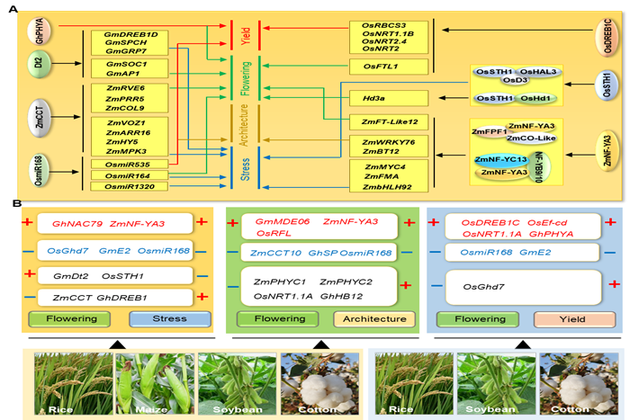该研究系统探讨了单子叶和双子叶作物在驯化过程中适应栽培地区开花和成熟的作用机制,从作物育种视角阐述了如何利用开花和早熟性调节基因加速育种的技术策略。同时,探讨了利用或改进多效性基因实现作物早熟、多抗、高产和株型等优良农艺性状高效聚合的育种方案。此外,针对当前作物育种存在的障碍和局限性,研究提出了新形势下作物育种的方向和实现优良性状聚合必须解决的问题:利用基因编辑技术修饰特定基因或其靶基因启动子,以阻断与不利性状相关的调控通路,同时保留理想性状,继而将多效性基因转变为聚合多种优良性状的“明星”基因;优化作物遗传转化方法,建立高效、便捷、周期短、不受基因型影响的作物遗传转化体系;利用空间单细胞测序技术在单细胞分辨率下系统鉴定所需的优异基因;加强多效性基因的功能广谱性探究,以扩大其在农业生产中的应用价值;最后,鉴于不同农艺性状均受到由各种环境因子、植物激素和转录因子等构成的高度复杂网络系统的调控,应投入更多精力阐明不同农艺性状的调控机制及其关系,这将有利于发现新的调控因子或改进已知的优异基因型。
