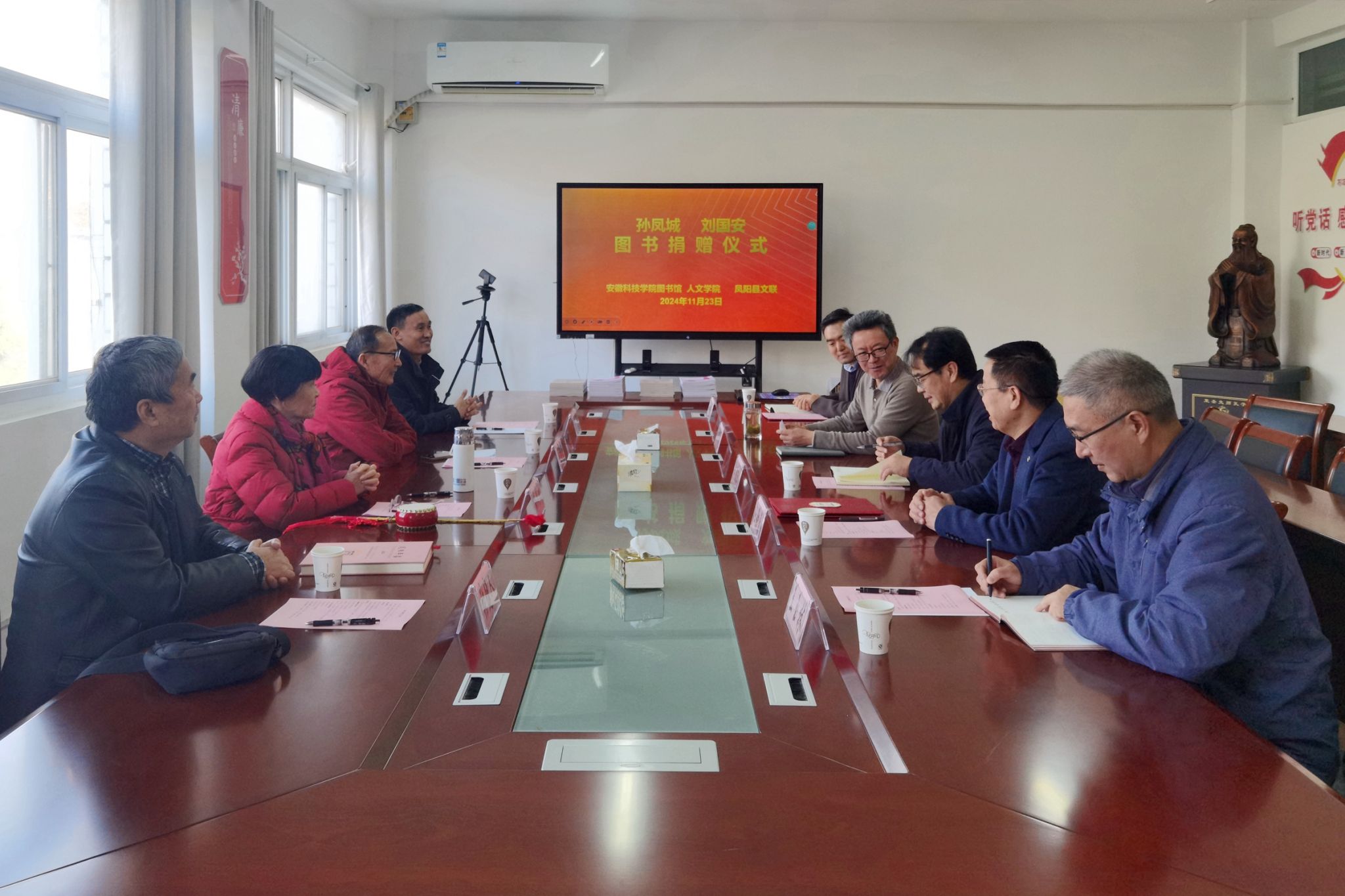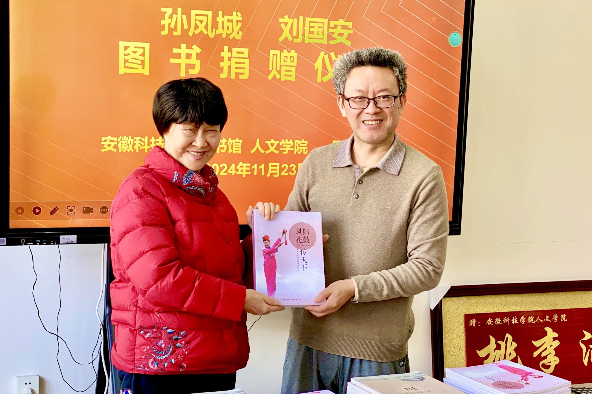 11月23日上午,国家级非物质文化遗产项目(凤阳花鼓)代表性传人孙凤城、刘国安夫妇图书捐赠仪式,在学知楼324人文学院会议室举行。乐鱼平台_乐鱼(中国)一站式服务平台客座教授——国家级非物质文化遗产项目(凤阳花鼓)代表性传承人孙凤城和凤阳电视台原副台长、安徽电视台特约记者、中国摄影家协会安徽分会会员刘国安,凤阳县文联主席陈友田,凤阳县教体局原副局长、凤阳年鉴主编张建人;人文学院院长、明文化研究会会长李晓东,图书馆馆长汪徐春、副馆长王玉林,人文学院中文系副主任、明文化研究会秘书长周广超参加相关活动。捐赠仪式由人文学院正处级组织员张严政主持。