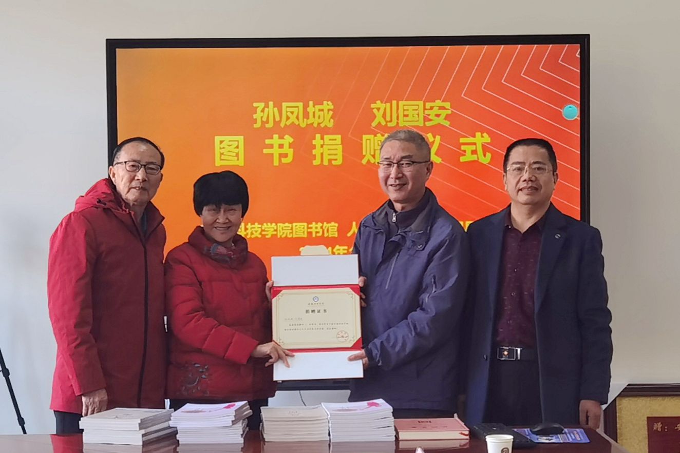 在图书捐赠仪式上,张严政、周广超和汪徐春、王玉林,分别代表人文学院和图书馆,接受孙凤城、刘国安夫妇和张建人捐赠的图书,并为其颁发捐赠证书。(特约通讯员:高晓宁 摄影:高晓宁 审核:张严政 李晓东)