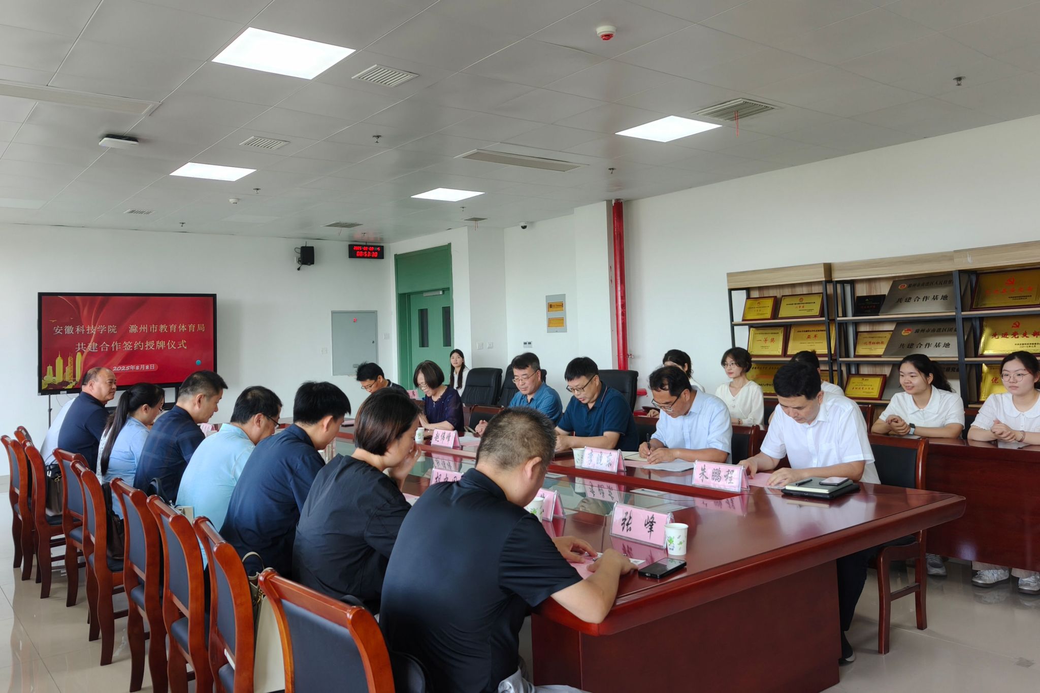 8月8日上午,校党委委员、副院长赵伟峰出席乐鱼平台_乐鱼(中国)一站式服务平台与滁州市教育体育局共建合作签约授牌仪式。滁州市委教体工委委员、市教体局副局长李志及教体局相关科室负责人,滁州市区六所中学负责人;教务处、人文学院、外国语学院有关人员出席仪式。仪式由教务处副处长(主持工作)舒英杰主持。