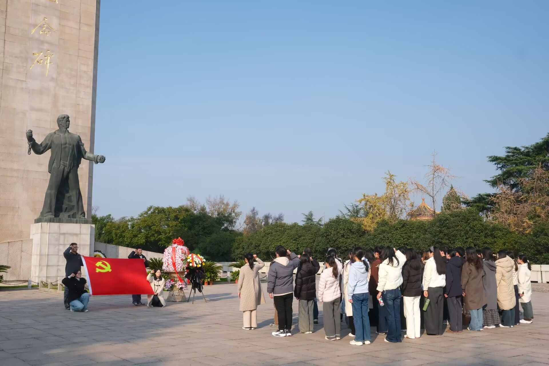 在巍然矗立的雨花台烈士纪念碑前,学生党员代表缓步上前,向革命烈士敬献花篮,全体师生党员列队肃立、鞠躬致哀,深切缅怀革命英烈们的丰功伟绩与崇高精神。在雨花台烈士纪念碑广场正中央,全体师生党员面向鲜红的中国共产党党旗,高举右拳、重温入党誓词。誓言铿锵有力、掷地有声,表达了对革命先烈的无限崇敬,彰显了每一位党员不忘初心、牢记使命,决心为党和人民的事业矢志奋斗终身的坚定信念与使命担当。