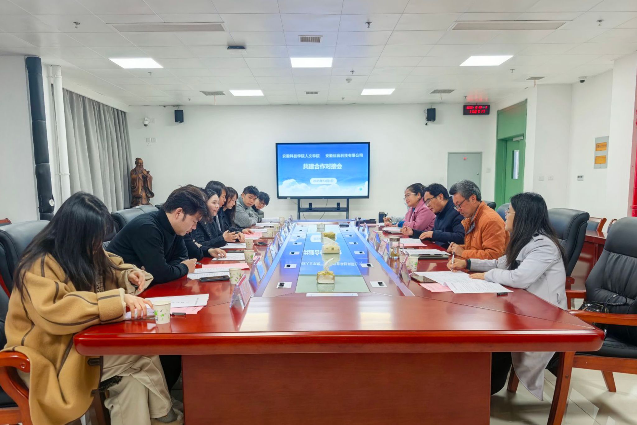 12月3日上午,人文学院与安徽优音科技有限公司举行共建合作对接会,商讨文化艺术合作及“明文化美育实践基地”建设。人文学院党政领导,安徽优音科技有限公司负责人李云、乐团指挥张洁等一行8人出席会议。会议由人文学院正处级组织员张严政主持。