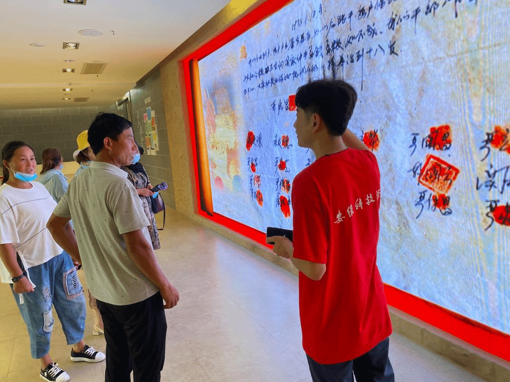 首先,在村主任的带领参观下,三名学生深刻感受到“穷则变,变则通,通则久”的小岗村精神,他的诞生是中华民族优秀传统文化求变图强基因的传承,也是中国共产党的先进文化“解放思想、实事求是,团结一致向前看”的探索成果。随后,在小岗村的党委办公室内,三名学生通过负责人不仅了解到小岗人民外出务工、近年生活变化、政策支持等各方面的情况,还参观了小岗人民居住区,沿着小岗村的田间地头,透过生活实际更深一步认识小岗村改革发展的成果及现状。在大包干纪念馆内,三名同学亲自上阵体验,为前来参观的游客进行义务宣讲,通过讲述小岗村改革开放的经过和十八枚红手印的故事,深刻的阐述了“敢闯、敢试、敢为天下先”的大包干精神,引得现场游客连连称赞小岗村民敢为人先。这就是小岗村内解放思想、实事求是的改革精神,敢闯敢试、敢为人先的首创精神,诚实守信、风险共担的担当精神。