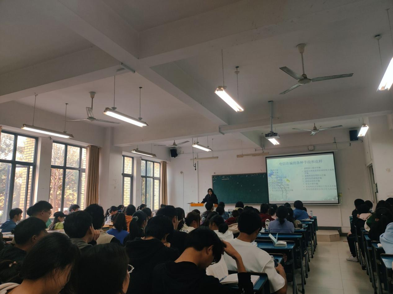 鲁冰冰向同学们通报了各高校本月的网络诈骗案件情况,介绍了电信诈骗的内涵,并向同学们普及了电信诈骗的各种花样和手段,其中最常见的就是刷单和假冒亲友突遭意外进行诈骗。之后,鲁冰冰又讲述了如何防范电信诈骗,最重要的一点就是需要克服“贪利”思想,不要轻信麻痹,谨防上当。本次讲座过程中,同学们积极进行互动,氛围活跃。最后,鲁冰冰还普及了电信诈骗举报方式并对同学们进行反电诈知识测试。