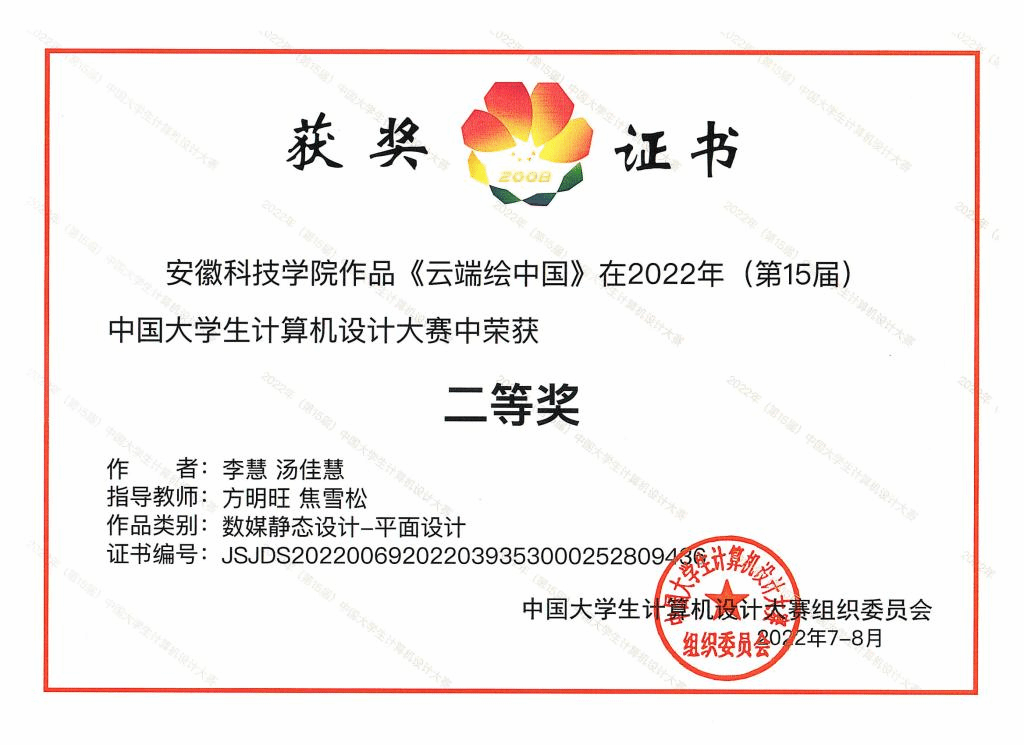 经过两个月激烈的角逐和专家评审,人文学院2支参赛队伍从全国1376支队伍中脱颖而出,李慧、汤佳慧同学的平面设计作品《云端绘中国》荣获二等奖,刘昱彤同学的平面设计作品《汉字拟人形象设计》荣获三等奖。