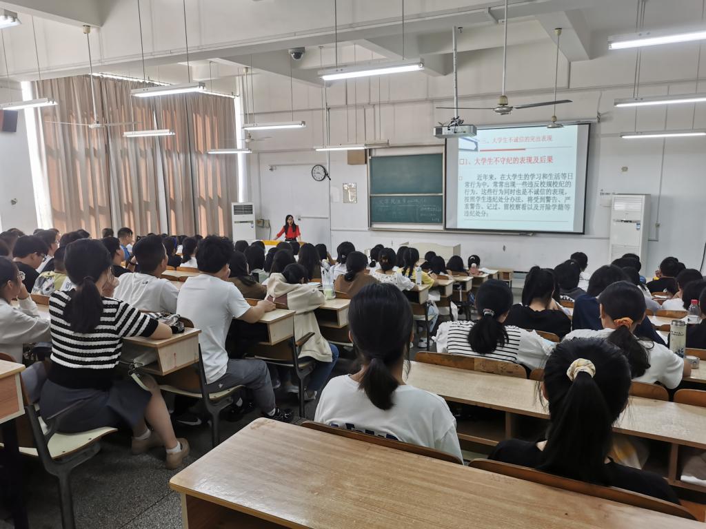 鲁冰冰讲述了诚信的含义与重要性,列举了少数大学生不守纪、不守法、不守信的突出表现及严重后果。她指出,大学生在生活方面应当遵规守纪、自尊自爱;在学习方面应当遵守课堂秩序,创建良好学风;在学术、资助、求职就业方面应该诚实守信。她带领全体新生学习了《乐鱼平台_乐鱼(中国)一站式服务平台学生日常行为规范》,讲述了大学生校园礼仪的重要性,在宿舍群体生活礼仪、校园课堂礼仪、师生交往礼仪、参加校园集体活动礼仪等方面提出了具体要求,认真回答了同学们就学习生活方面提出的具体问题,帮助新生更好的完成“大学生”身份的转变。
