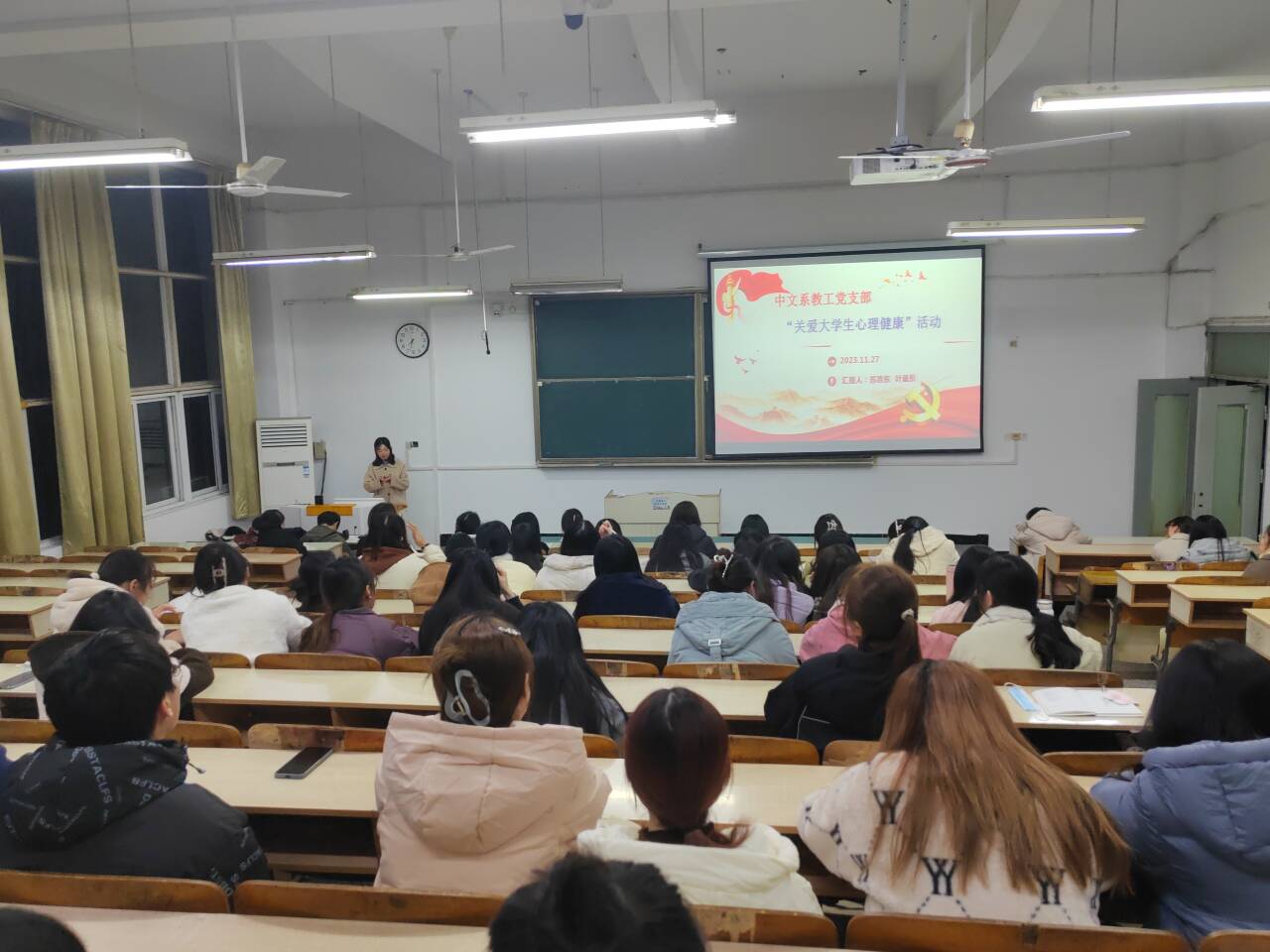 为帮助人文学子合理规划大学生活,解决有关考研考公及就业等方面的心理问题,11月29日晚,中文系教工党支部于求知楼A101教室举办“关爱大学生心理健康”交流会,邀请人文学院教师叶童彤、苏浩东主讲。人文学院汉语言文学专业21级全体同学参与。