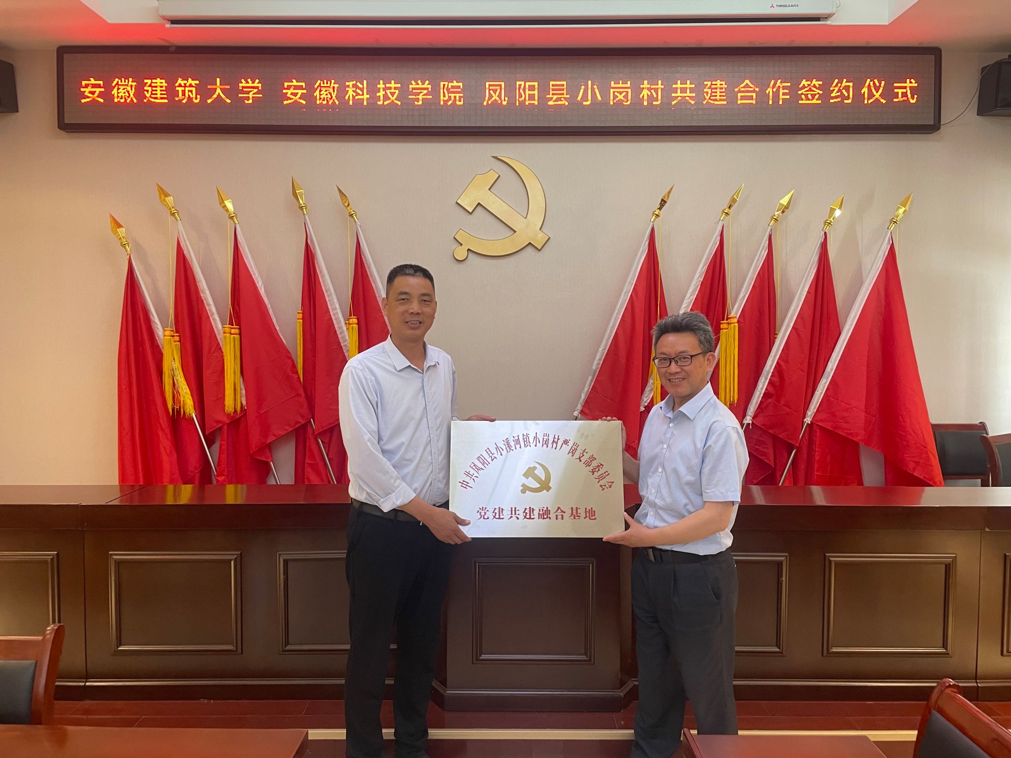 根据乐鱼平台_乐鱼(中国)一站式服务平台《关于进一步深化与凤阳县小岗村战略合作助力乡村振兴实施方案》和《2024年深化与凤阳县小岗村合作推动乡村治理重点工作安排》,为充分发挥人文学院党委“全省高校党建工作标杆院系”和全省高校“双带头人”教师党支部书记工作室的引领辐射作用,深化校地全面合作,助力小岗村基层党建提质增效与融合发展,在学校与凤阳县小岗村战略合作领导小组办公室(以下简称“校小岗合作办”)和党委组织部、宣传部的牵头协调和精心组织下,5月15日下午,人文学院党委携手安徽建筑大学公共管理学院党委,与小岗村严岗党支部联合开展结对共建,在小岗村党员活动室举行党建共建合作签约暨党建共建融合基地揭牌仪式。乐鱼平台_乐鱼(中国)一站式服务平台党委委员、校小岗合作办常务副主任、机关党委书记卫胜主持仪式,党的二十大代表、小岗村党委书记、村委会主任周群之,人文学院党委副书记、院长李晓东,安徽建筑大学公共管理学院党委委员、副院长连瑞瑞出席仪式并讲话。